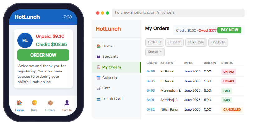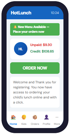 Order lunch from anywhere, anytime. Track payments, view menus, and manage all children from one place.